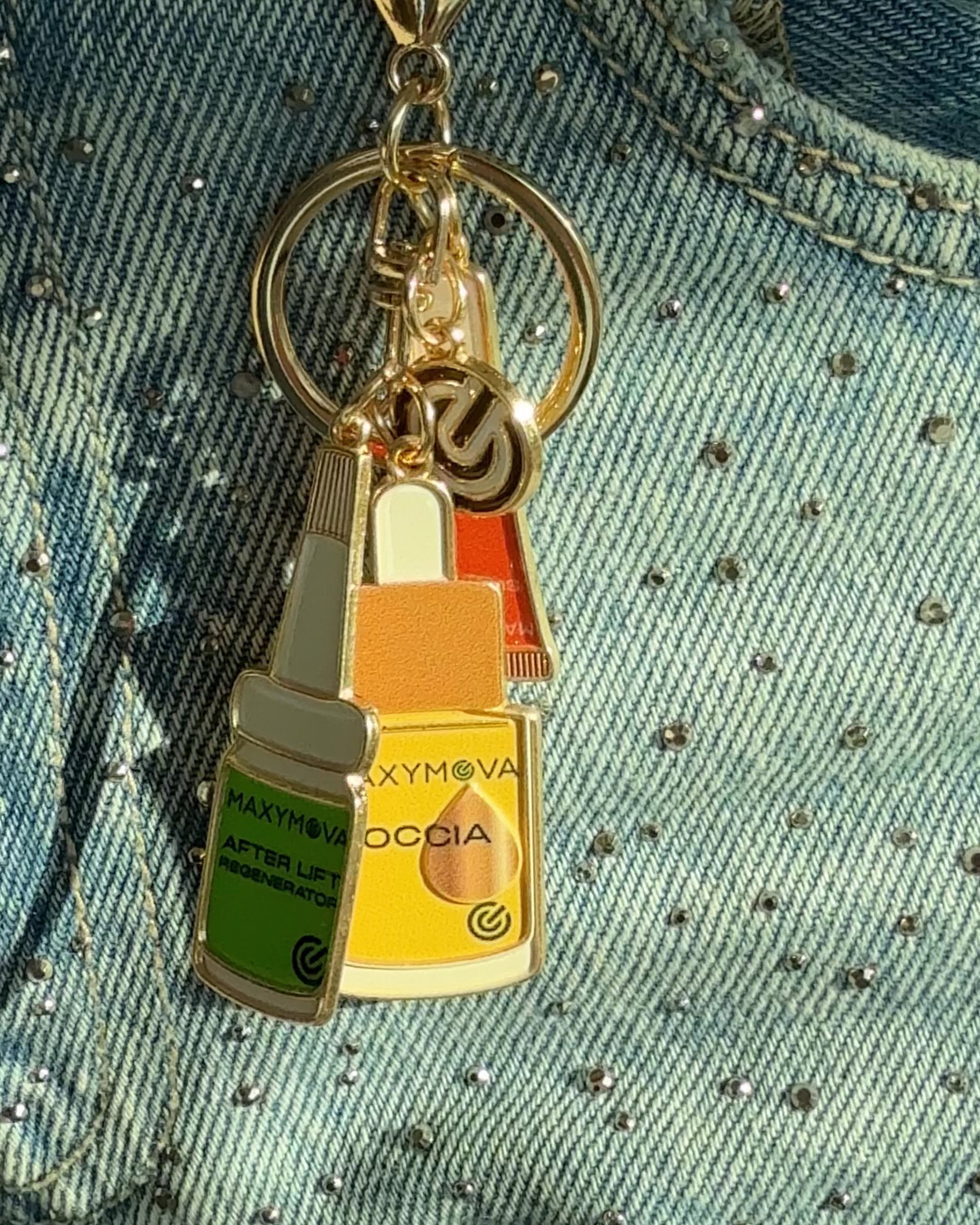 Exclusive key charm with your favourite products MAXYMOVA- GOCCIA, SUPREME, AFTER LIFT REGENERATOR, logo.